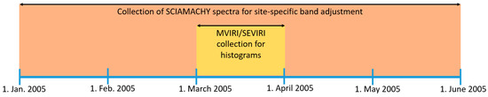 Illustration of the approach for the MVIRI/SEVIRI comparison. Site-specific spectral band adjustment functions between the two MVIRI datasets and the SEVIRI HRVIS band are computed based on SCIAMACHY spectra that are collected during a five-month period. The five-month period envelops the one-month period during which the actual MVIRI and SEVIRI data are collected that are displayed in the histograms.