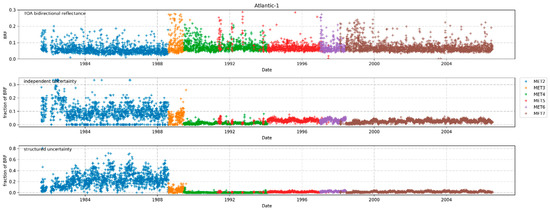The reflectance is provided along with independent and structured uncertainties at pixel level that are rigorously traced from effects of each parameter of the measurement equation (Figure 1). Independent uncertainties are caused by errors that have no spatiotemporal correlation properties. In the MVIRI case this is the noise of the earth counts that is described in Section 3.2. Structured uncertainties come from parameters of the measurement equation that are subject to spatiotemporally correlated errors. The different structured uncertainty effects are described in Section 3.3, Section 3.4, Section 3.5 and Section 3.6. The combination of the effects finally is explained in Section 3.7, Section 3.8 and Section 3.9 describes the methods that were employed for the validation of the new dataset.