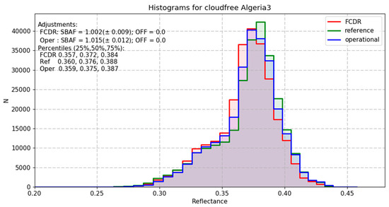 The spatiotemporal sampling of MVIRI and SEVIRI is different and close collocations are only available at certain locations of the fulldisk. In order to account for the significant differences of the sampling (~7 min) at the target sites, this study relies on the comparison of histograms that are collected during a longer period. This compensates, for example, for dynamic atmospheric features that are not at exactly the same pixel locations in all datasets. In order to ensure the representativeness of the spectral band adjustment functions for the comparison, the five-month period for the collection of the SCIAMACHY spectra envelopes (Figure 6) the one-month period for the collection of the histograms. Three datasets are compared: (a) the operational Meteosat-7 MVIRI product, (b) the FIDUCEO MVIRI FCDR product and (c) the operational Meteosat-8 SEVIRI HRVIS product. The SEVIRI measurements are considered a superior reference because of the improved pre-launch characterisation as compared to the MVIRI instrument. The MVIRI measurements are band adjusted to the SRF of the HRVIS band using the same methodology as outlined in Section 3.9.1. Histograms from the three datasets are extracted with a maximum time difference of 7 min over four spectrally different targets. The radiometric calibration of the SEVIRI and MVIRI measurements uses the same radiative transfer model and surface and atmosphere parameterisation [8]. Differences between the histograms therefore directly point to problems of the spectral response functions. The improvements of the MVIRI FCDR over the operational MVIRI product are discussed for each region in Section 4.3.