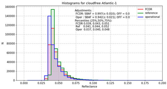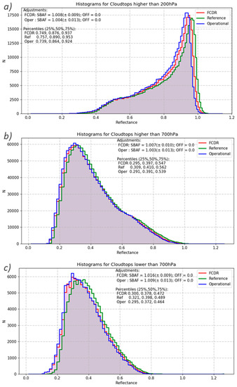 The comparisons between the three datasets, i.e., (i) the operational calibrated MVIRI VIS dataset, (ii) the recalibrated MVIRI VIS FCDR, and (iii) the operational SEVIRI HRVIS dataset, show that the trueness of the FCDR has improved above clouds and ocean. Above Algeria-3 the histograms of clear-sky reflectances from both MVIRI datasets do not deviate much from the histogram of the SEVIRI dataset (Figure 13). Only a subtle bright-bias against SEVIRI is observed in both, the operational MVIRI VIS dataset and the MVIRI VIS FCDR. The good fit for this site is attributed to the fact that the three datasets were all calibrated using desert sites with comparable, red spectral characteristics. While this forces all instruments to measure the same over desert-like sites, a bias is introduced as soon as objects in the Field of View (FoV) have a different spectrum, such as clouds and oceans. This is apparent in the cloud histograms shown in Figure 14. This Figure shows the histograms of fully clouded pixels with cloud-tops at three different pressure levels (high clouds (above 200 hPa), middle clouds (between 200 hPa and 700 hPa) and low clouds (below 700 hPa)). From the Figure it can be seen that reflectance values across all cloud levels are lower in the operational MVIRI dataset than in the SEVIRI HRVIS dataset. In the histograms of the recalibrated MVIRI FCDR this dark bias is slightly reduced for low and middle clouds and fundamentally reduced for high clouds. For high clouds, the observed shift towards brighter cloud reflectance values would affect the top of the atmosphere outgoing shortwave radiation by roughly 8 W/m2. Similar behaviour is observed over the Atlantic-1 target. Here the histogram from the operational dataset is also darker than that from the SEVIRI dataset (Figure 15) and the histogram from the recalibrated MVIRI VIS FCDR matches much better with the histogram of the SEVIRI dataset. The better match between the FCDR and the SEVIRI dataset is encouraging and confirms that the clear-sky and cloudy reflectances of target sites with different spectral characteristics are better (assuming SEVIRI is the better characterised instrument) represented when using reconstructed SRFs than when using original (operational) SRFs.
