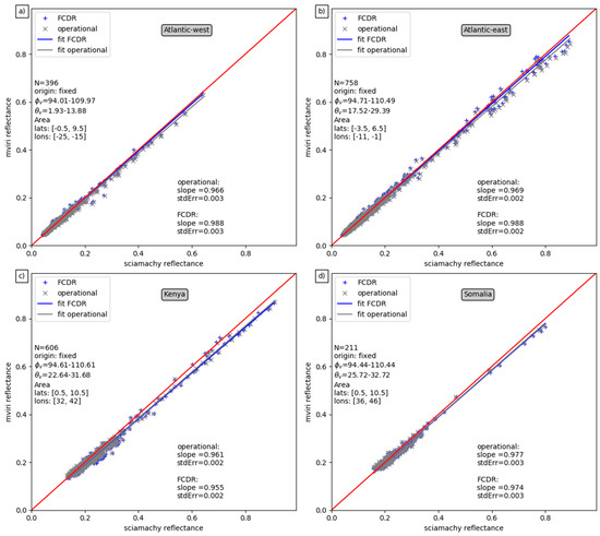 Collocations between SCIAMACHY and MVIRI onboard MET7 for (a) Atlantic-west, (b) Atlantic-east and (c) Kenya. Collocations between SCIAMACHY and MET5 are provided in (d) for Somalia. Grey marks stand for the dataset with the pre-launch SRF characterisation. Blue crosses stand for the harmonised/recalibrated FCDR. The collocations are constrained to relative azimuth angles between the two instruments of 5°, to zenith angle differences of 15° and to acquisition time differences of 5 min. Only collocations with MVIRI standard deviation of below 0.12 within a SCIAMACHY pixel are considered. Over the Atlantic areas and the Somalian area collocations were acquired from data collected during 2002–2006, whereas data collected during 2006–2010 were used for the collocations over the Kenyan area.