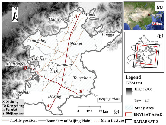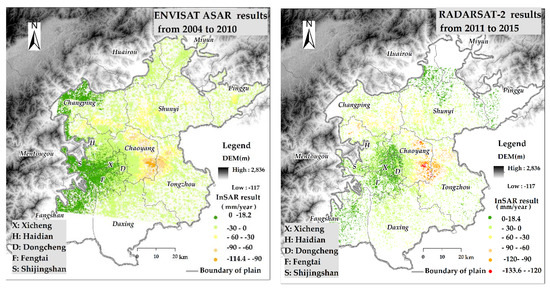 34] used TerraSAR-X and ENVISAT ASAR data to determine the surface deformation characteristics of the Beijing Plain. The authors determined that the maximum expansion direction of land subsidence on the Beijing Plain was East and that the growth rate was 11.3 km