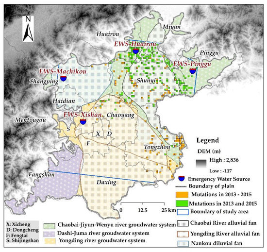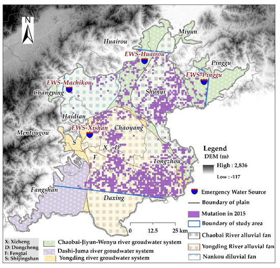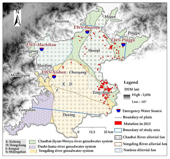 Figure 11). The spatial distribution almost completely encompassed the upper and middle parts of the alluvial-diluvial fan of the Chaobai River. From the perspective of administrative regions, most of the sites were distributed in the south-western region of Huairou, the southern region of Miyun, the western region of Pinggu, and Tongzhou district. The reason for the sudden change in 2013 may be the long-term overexploitation of emergency water sources, which led to the imbalance of the groundwater system.