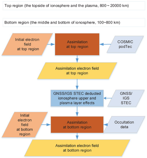 Figure 5 shows the data processing workflow in the ionospheric assimilation process in this study. Due to the sparse and uneven distribution of ground stations and the height of GPS satellites (approximately 20,000 km), the ionospheric structure path distribution was presented as the cross shapes of cones whose apexes were ground-based stations or GPS satellites for the main part of the ionospheric assimilation using mainly ground-based GPS observation data, and the structural information was evenly distributed from 200 to 500 km, which is the range of the peak ionospheric height. The non-uniformity of the distribution information, especially in the top region, had a greater impact on the numerical solution in the assimilation; therefore, the top region and bottom region were selected for step-by-step assimilation. First, the assimilated model for the top region was obtained, as the podTec data improve the empirical model for the top region, from Wu et al. Then, the top region contribution was subtracted from the ground-based observation data, which was assimilated with the occultation observation data from the IRI or Wu et al.’s ionospheric model (called the IRI-Imp model) as the background field for the bottom region. Finally, a high-precision ionospheric model for the bottom region was obtained.