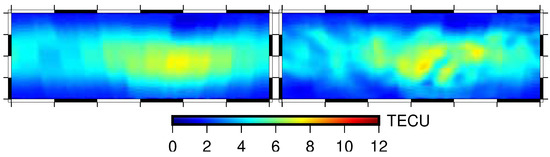 VTEC map of the top region at 16:00–18:00 UTC on DOY 010, 2008: (left) the model constructed by the method of Wu et al.’s; and (right) the model that was re-assimilated using podTec with the constructed model.