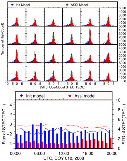 Figure 9 shows the error of the observed data on DOY 010, 2008 subtracted from the IRI model before and after assimilation with the corrected ground-based/spaceborne ionospheric data. The top panel shows the distribution of the residual STEC between the corrected ground-based/spaceborne ionospheric data and the IRI model of the bottom region or the model of the bottom region assimilated using the corrected ground-based/spaceborne ionospheric data with the IRI model on DOY 010, 2008. Although the IRI model could better describe the real-time ionospheric electron density distribution in the ionospheric quiet period, a large standard deviation still existed before the step-by-step assimilation at the bottom region. After the bottom assimilation, the residuals was more concentrated, and the standard deviation was significantly decreased.