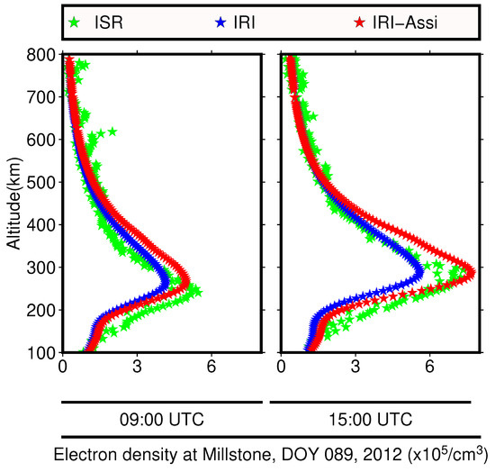 Electron density profiles (EDP) of the ISR and ionospheric models of Millstone: (left) EDP at 09:00 UTC; (right) EDP at 15:00 UTC.