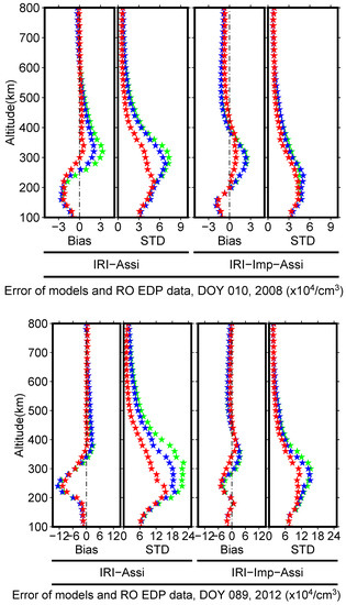 Compared with the ionosonde data, the assimilation results for these two days (DOY 010, 2008 and DOY 089, 2012) can lead to a consistent conclusion, and the improvement of data assimilation algorithms on DOY 089, 2012 was more significant, thus only the results of DOY 089, 2012 are described. The consistency between the IRI model and the IRI-Imp model introduced by Wu et al. and their respective assimilation models (IRI-Assi and IRI-Imp-Assi, respectively) through the “G/S+Cor” strategy are presented in Figure 10 along with ionosonde data on DOY 89, 2012. The left subgraph demonstrates that the assimilation algorithm could correct the initial field, thereby making it more similar to the ionosonde observation data, and the degree of improvement was also very obvious in its correlation. The correlation of the IRI-Assi model increased from 0.730 to 0.785. In comparison with the IRI model, the correlation of IRI-Imp increased from 0.730 to 0.745, but the assimilation algorithm still increased the correlation of the assimilation results to 0.787. The right-hand subfigure illustrates that the bias of the IRI model was relatively small relative to that of the ionosonde data, but the assimilation algorithm increased the proportion of the smaller part of the error, indicating that the assimilation algorithm significantly improved upon the IRI-Assi model, while the IRI-Imp model was corrected by occultation data. Compared with the IRI model, the error was significantly reduced, but a large correction remained after assimilation, and the large deviation was obviously suppressed, thereby reducing the error.