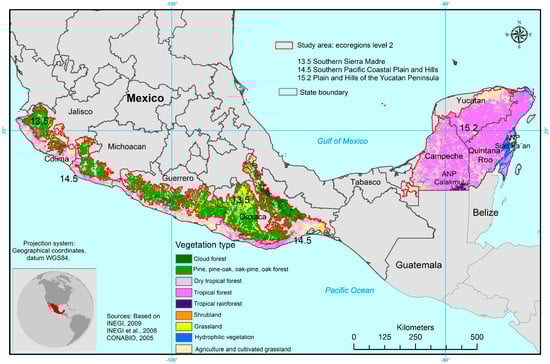 Three ecoregions in southwestern and southeastern Mexico, 22°0′–15°3′N and 86°30′–105°45′W, were selected for the study (Figure 1). The three ecoregions are forest dominated and susceptible to fires, but they differ in their natural characteristics and ecological response. These are 3 of the 22 ecoregions recognized by the ecoregion map of Mexico [23], and were selected according to the following criteria: (1) representative area of a forest ecoregion; (2) located within political states reporting a high incidence of forest fires (CONAFOR); (3) ecoregion with active fires identified with the Early Warning Forest Fires System, operated by the National Commission for Knowledge and Use of Biodiversity (CONABIO) [24]. The three ecoregions selected were: (a) Southern Sierra Madre (ecoregion 13.5), dominated by temperate forests (e.g., pine, oak, pine-oak, and cloud forests); (b) Southern Pacific Coastal Plain and Hills (ecoregion 14.5), characterized by dry and tropical forests; and (c) Plain and Hills of the Yucatan Peninsula (ecoregion 15.2), dominated by tropical forests.