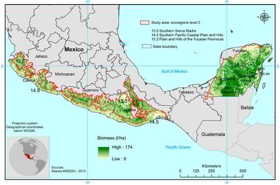 - Alianza MREDD. Mapa y Base de Datos sobre la Distribución de la Biomasa aérea de la Vegetación Leñosa en México; Versión 1.0; Woods Hole Research Center, USAID, CONAFOR, CONABIO, Proyecto México-Noruega: Zapopan, México, 2013. [Google Scholar]