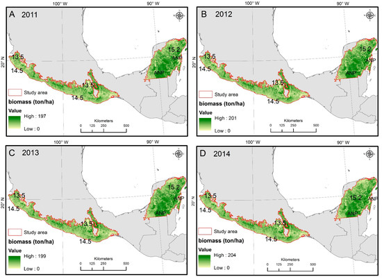 The map (Figure 2) shows high biomass values in the mountain in the ecoregion Southern Sierra Madre (13.5), which is characterized by temperate forests, as well as in the ecoregion Plain and Hills of the Yucatan Peninsula (15.2), where tropical forests dominate. The values were intermediate in the Southern Pacific Coastal Plain and Hills (14.5). Figure 3 shows the four annual biomass results, and Table 1 lists the correlation between the biomass map and biomass from NPP. Both biomass products have a similar behavior in each year, with differences in the quantity of the biomass as a response to meteorological conditions. The NPP data allowed for the interpretation of annual changes and the annual adjustment of the biomass variable.