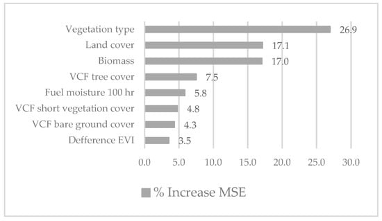 For the Random Forest Regression (RFR) model, the OOB estimate yielded a correlation of 0.73 between the observed and predicted values, an absolute error of 0.079, and an RMSE (Root Mean Square Error) of 0.009. The model explained 49% of the variance in the data. The variables with a higher importance in the RFR model were (Figure 4): the vegetation type, land cover, biomass, VCF (Vegetation Continuous Field) tree cover, and 100 h fuel moisture; of these variables, the fuel moisture was the most dynamic variable (daily) and had a coarser spatial resolution. The least important variables were the VCF short vegetation cover, VCF bare ground cover and EVI; this last variable is dynamic, because it changes throughout the year.