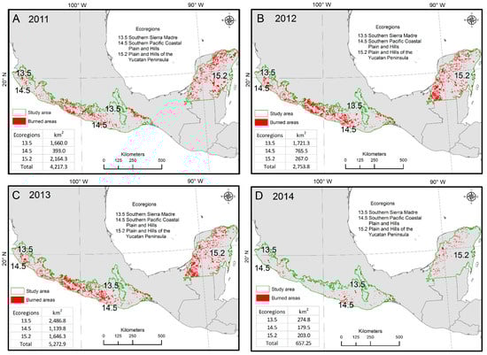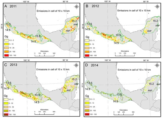 Figure 5 shows all of the burned areas identified by the MCD64 product in the period of 2011–2014. Spatially, zones with a concentration of burned areas were identified, as in the Guerrero and Oaxaca States into Southern Sierra Madre and Southern Pacific Coastal Plain and Hills ecoregions, or in the Yucatan and Campeche States into Plain and Hills of the Yucatan Peninsula ecoregion. Temporarily, there were large differences in the period; 2014 reported less than 1000 km2, in this case we expect fewer emissions. Meanwhile, other years reported more than 2000 km2 of burned areas. The extreme case was in 2013, when were reported more than 5000 km2 of burned areas, which could be translated into eight times more emissions that in 2014.