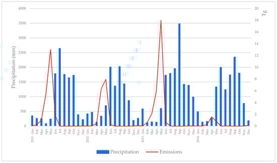 The month with the highest emissions was one month after the driest month and before the wet season; therefore, May, April, and March had >90% of all emissions. The remaining 10% was distributed mainly among the other months of the dry season, with a smaller proportion in the wet season months. In none of the four years were there emissions recorded in September, the month before the end of the wet season and often the month with the highest precipitation. Only two years showed any emissions in August (0.03%) or October (0.01%). The 2013 wet season was the wettest of the four years; hence, in 2014, fires were fewer and the emissions were the lowest (Figure 7). The dry season in 2013 was the driest, and it had the highest emissions.