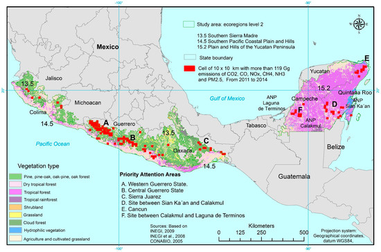 Six areas were considered to be of interest because of a concentration of cells with emissions exceeding 119 Gg and because they were spatially continuous (Table 6 and Figure 8). Three areas were in temperate forests and the remainder were in tropical forests. The origin of forest fires in these areas is associated with agricultural activities and urban expansion; e.g., in Cancun, the cells with a concentration of emissions were along the highway and close to the urban area. When fire used in agricultural and urban activities loses control and involves natural vegetation, it is considered a forest fire.