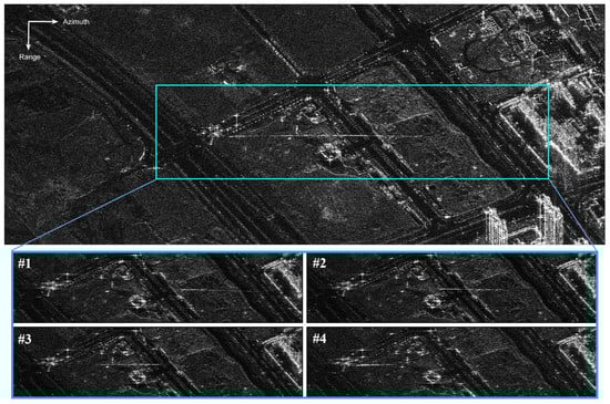 The SLC image to be processed is collected in spotlight mode over Nanjing city, China, 2017. The related parameters are listed in Table 1. A small region in SLC image is processed to demonstrate the proposed method. The corresponding SAR image is shown in Figure 1 upper figure. The horizontal and vertical directions are the azimuth and range respectively. A moving target signature can be seen as denoted by the blue box. The target’s image trace spans around 430 m along azimuth direction. To show the motion of moving target’s signature, four subaperture images of the area bounded by the blue box are generated as shown in bottom of Figure 1. According to four images, it is clear that the moving target signature moves from right to left. The goal of this paper is to use the proposed method to detect the moving target.