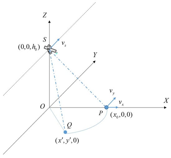 The SAR satellite’s orbital trajectory is usually defined by the parameters of orbital elements. However, since the Gaofen-3’s observation time (12.5 s) and aspect angle () are small, the linear trajectory is sufficient for the deduction. In addition, the flat earth is assumed for deduction convenience. For moving target, the simple constant speed motion is analyzed. The acquisition geometry at time is shown in Figure 2. X and Y axes are range and azimuth direction respectively. is the ground plane. The SAR sensor(denoted as S) moves along Y direction at height with velocity . A constant speed target P moves in ground plane with velocity . Because of symmetry reason, the target is characterized as lying on the X axis when . The target/SAR motion functions are listed in Table 2.