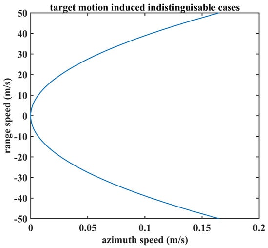 Some interesting studies about a moving target image trace have been reported. Jao deduced the functions of constant speed target’s image trace in linear trajectory SAR []. It has shown that its shape is an elliptic or hyperbolic curve. In [], Chapman analyzed the indistinguishable problem between moving target and stationary target signature. He points out that image sequence-based detection suits spaceborne condition for linear trajectory SAR, since the platform’s high speed limits the happening of indistinguishable problem. Here, we adopt the method [] which was proposed by our team to conduct the analysis.
