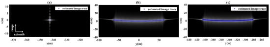 In order to validate deduced target image position functions, the point target simulations are conducted. The parameters of Gaofen-3 in Table 1 are used in the simulation. Three moving targets A,B,C are considered. Their motion parameters are given in Table 3. The first two targets are set to show the shapes when the target only has azimuth or range speed. Target C has both range and azimuth speed, and the azimuth speed is equal to target B. The purpose of these two targets is to demonstrate that the target’s azimuth smearing lengths are equal when they have same azimuth speed. After SAR processing, the images of three targets are shown in Figure 4. The blue ′*′ denotes the predicted image trace using (2).