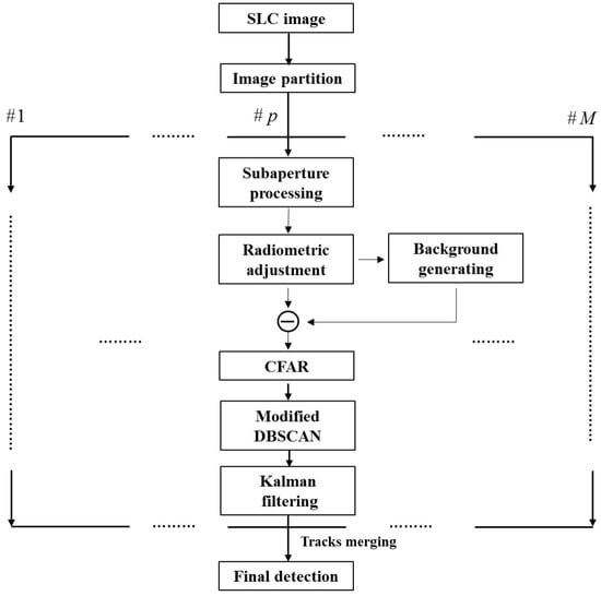 The flow chart of the proposed method is shown in Figure 6. The algorithm consists of the following steps: (1) Input the SLC spotlight SAR image; (2) Partition the SLC image into M patches. (3) For p patch, generate the overlapped subaperture image sequence via subaperture processing. All subaperture images are indexed with corresponding azimuth viewing angel. Suppress the speckle noise and transform the image sequence into dB unit to get the Overlapped Subaperture Logarithm Image (OSLI) sequence; (4) Apply radiometric adjustment to the OSLI sequence to suppress the antenna illuminating effect; (5) Apply the median filter to the OSLI sequence along the third dimension (corresponding to the azimuth viewing angle) to generate the background image; (6) Use the radiometric adjusted OSLI sequence to subtract the background image; (7) Apply the CFAR detector on each image to get a set of binary image results; (8) Cluster the potential moving target by performing the modified DBSCAN on each binary image; (9) Input the clustered potential targets to the Kalman tracker to obtain the detected moving targets’ track from patch p; (10) Merge the tracks from all M patches as the final detection output.