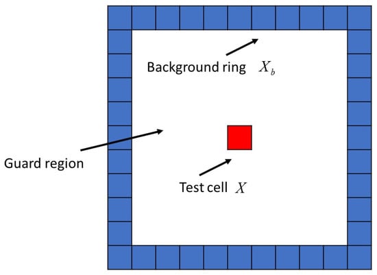 A CFAR detector is applied using a sliding window centered around the test cell as depicted in Figure 9. The data of background ring is used for estimating the parameter (mean and standard deviation ) of Gaussian distribution. The expression is given as: