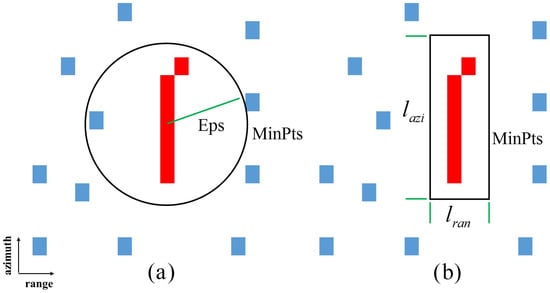 To apply conventional DBSCAN on the coarse detection result (binary image) needs two parameters to form a cluster: Eps and MinPts. The Eps represents the neighbor radius of a given pixel. MinPts is the minimum number of pixels needed to compose a cluster, i.e., the density threshold. As shown in Figure 10a, the red part denotes the moving target signature and the blue pixels denote the false detections. Since the moving target signal is defocusing along azimuth and, hence, presents as line shaped signature, we apply the conventional method directly on the binary image and we may classify the adjacent false detection as part of a moving target candidate. To solve this problem, we use a rectangle rather than a circle to perform the clustering. Figure 10b illustrates the modified DBSCAN. The length of rectangle along range and azimuth direction are and . The two parameters and Minpts need to be tuned to get good clustering performance. So far the parameters are set according to experience.