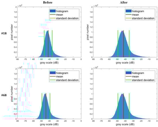 Next is to apply the radiometric adjustment on acquired OSLI sequence. According to (10), the obtained common values are and . Then, using (11) to adjust the histogram of images in OSLI. Figure 12 shows results of 18th and 68th image before and after applying intensity normalization. The red line and green line in images denote the mean value and standard deviation. The first column is histograms of two images before applying intensity normalization. From the subfigures, the mean value and standard deviation of 18th and 68th are not equal. After applying the method, the corresponding parameters are equal as shown in the right side column. Apply this process to all the images in the OSLI to reduce the antenna illumination effect, then generate the corresponding background image with the adjusted OSLI.