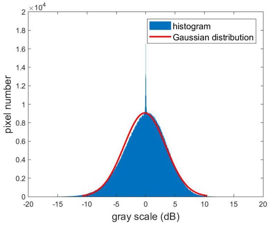 In (13), the represents subtraction result of ith image in OSLI sequence. Since the background image and the image in OSLI are all expressed in dB unit, the subtraction process is equal to the ratio process. Due to the subtraction process, the unchanged parts (static clutter) in OSLI are gathered around zero in histogram of , while the changed parts(moving target signal) are persevered and fall into the tail of the histogram of . Compare the conventional log-ratio operator in reference [], expression (13) has the same form. Log-ratio operator is widely used in change detection applications, and the Gaussian distribution is suggested for modeling the ratio image as in []. In addition, paper [] used the real data to prove the effectiveness of modeling the foreground image with this distribution.