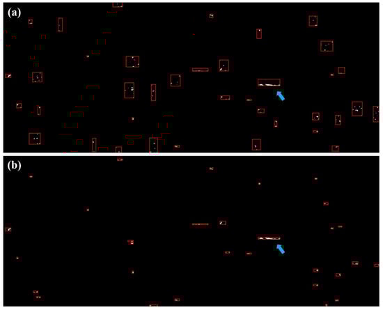 To implement the modified DBSCAN algorithm, three parameters are required: size of rectangle and density threshold MinPts. The size of the rectangle is pixels and pixels, the MinPts is 40. These empirical parameters are acquired by testing, their effectiveness are validated with both experiment results and performance analysis. The optimal parameter and automatic parameter selection is part of further work. To demonstrate the modified DBSCAN method and make a comparison with the conventional DBSCAN method, we apply them to the 18th binary image. The results are shown in Figure 15. The Figure 15a,b are results of the conventional method and the proposed method, respectively. Each cluster is denoted with a rectangle using the minimal bounding box parameter. The arrow points to the moving target signature. From (a) and (b), we can see the target signature in two images are both broken, but the broken parts are well classified as one cluster as expected. Moreover, compared with CFAR result in Figure 14, those low density false detections are excluded in Figure 15a,b. However, comparing (a) and (b), although the real moving target signature in two images are all classified as one cluster, the minimal bounding box in (a) is larger than the box in (b). It means that the adjacent false detections and real moving target signature are falsely classified by conventional method, which matches the previous analysis. From (b), we can find that this disadvantage is avoided by the modified DBSCAN method. In addition, we can also see that the conventional method has more falsely classified clusters. Thus, the comparison proves that the modified DBSCAN method is better than conventional method when classifying moving target signature. The modified DBSCAN is, therefore, demonstrated.