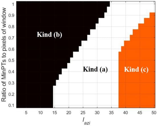 Then we evaluate influence of the parameters and Minpts on the modified DBSCAN’s performance. The modified DBSCAN has two goals, the first is to cluster the broken signature as one cluster, the second one is to reduce the false alarm. Because the moving target signature defocuses along azimuth direction rather than range direction, the and Minpts play key roles in this step. For convenience, the Minpts is expressed with ratio of Minpts to pixels of sliding window to suit different . We characterize performance with two factors: the clustering accuracy on real target signature and the false alarm rate.