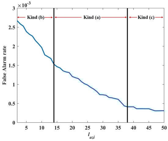 In Figure 16, the black part and orange part are the wrong classifications, kind (b) and kind (c), respectively. The white part denotes the right classification kind (a). It is clear that real target signature can not be correctly clustered when , partly corrected clustered for . For , the target can be corrected classified for all . The selected parameters , , (i.e., ) lie in this interval, which shows the effectiveness of the parameters. Since for all , the target can always be correctly clustered when , the false alarm rate versus when is analyzed. The result is shown as Figure 17.