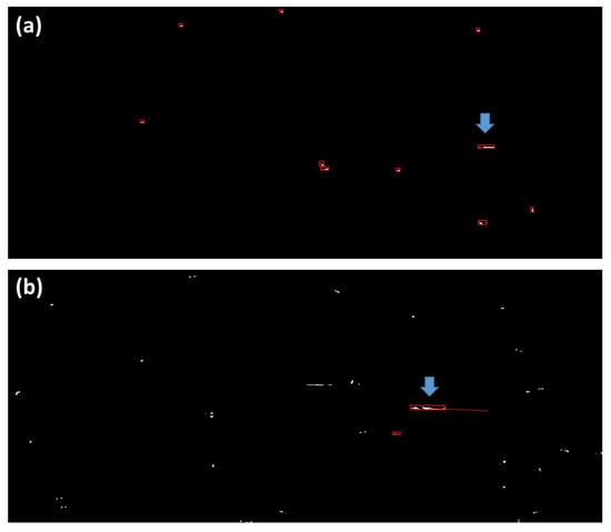 After applying modified DBSCAN, the residual false detections are eliminated by utilizing the true target’s dynamic behavior. Apply the Kalman tracker to the first image, then using the clustering results to update the tracks iteratively. 10 clusters are obtained in first clustered image, thus there are 10 tracks being initialized as shown in Figure 18a. Blue arrow denotes the moving target. The clusters correspond to the tracks are labeled with red rectangles according to the parameter of minimal bonding box.