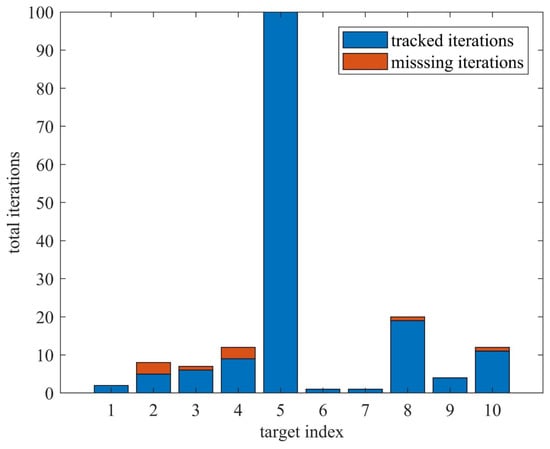 The blue and orange part correspond to tracked iterations and missing iterations, respectively. The 5th track is a real moving target, which shows it is tracked in 100 iterations without missing. The rest of the tracks correspond to the false detections stop updating after 20 iterations. We collect the maximal azimuth moving distance of ten tracks, and compute the corresponding azimuth speed according to (5). Table 4 shows the results. According to (21), we set the 100 m as the threshold. Then, the final result is just the 5th track.