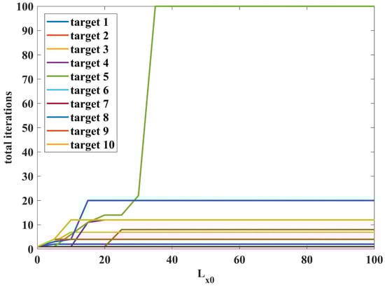 In the figure, the total tracked iterations of all ten tracks increase as increases, then they reach their maximum value and maintain stability. The fifth is the real target; we can see that the tracking performance is degraded when the is lower than 35. When , its tracked iterations reaches 100 and maintains this value. Thus, for , the tracking performance can be guaranteed.