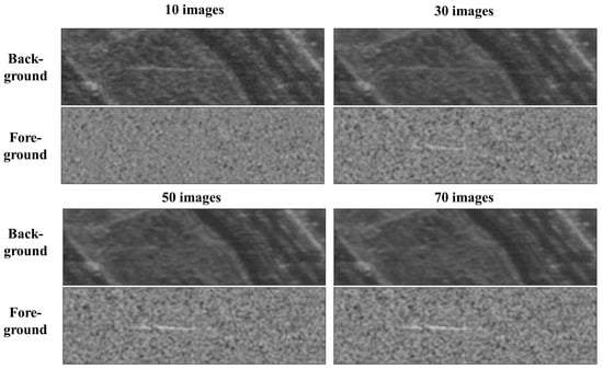 The examples show results using 10, 30, 50, 70 images to perform background generation and subtraction. The first and third rows are the background image. The second and fourth rows are the foreground image. In ten image result, the moving target signature is not filtered, thus, the target signature is canceled in the corresponding foreground. When increasing n, the background image becomes cleaner and the target signature becomes stronger in the foreground image. In 70 image result, the target signature is almost filtered and the target signature is the strongest among the four examples. Thus, it is clear that the more images are used, the better performance we can obtain.