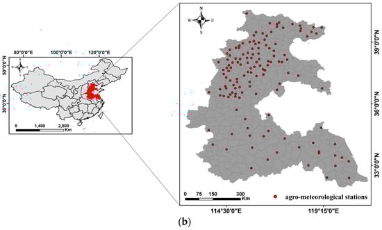 Two major winter wheat dominant areas, i.e., Kansas, USA (94–102°W and 37–40°N) (Figure 1a) and the NCP, China (111–123°E and 33–41°N) (Figure 1b), were selected as the regions of interest. Most US wheat is grown in the Great Plains from Texas to North Dakota, accounting for about 75% of national wheat production (http://www.fao.org/docrep/006/y4011e/y4011e04.html). About 41% of the total US wheat production is of the Hard Red Winter (HRW) class, and most HRW wheat is grown in the central and southern Great Plains states. Kansas lies in the heart of the central Great Plains region and is one of the major winter wheat producing states in the Great Plains [35]. The NCP is the largest agricultural area in China [36], also known as the “breadbasket of China”, accounting for about 71% of the country’s wheat production [34,37,38,39]. It covers two metropolises (Beijing and Tianjin) and five provinces (i.e., Anhui, Hebei, Henan, Jiangsu, and Shandong) [40].