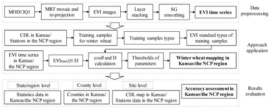 To train and validate the proposed approach, we collected the Cropland Data Layer (CDL) from CropScape (http://nassgeodata.gmu.edu/CropScape/), developed by the United States Department of Agriculture National Agricultural Statistics Service (USDA-NASS). The spatial resolution of the CDL varies from 30 to 56 m, depending on the imagery source [33,44]. Winter wheat was mapped at an annual interval since 2006 for Kansas, with overall accuracies over 90% for both producer’s accuracy and user’s accuracy in 2017 CDL (https://www.nass.usda.gov/Research_and_Science/Cropland/metadata/metadata_ks17.htm). The producer’s accuracy is a measure of the omission error and is defined as the number of correctly classified pixels of the class relative to the total number of pixels of that class used in the assessment. The user’s accuracy is a measure of the commission error associated with a class, which is derived from the number of pixels correctly allocated to a class relative to the total number of pixels predicted to belong to that class [45]. For this study, we used 2017 USDA CDL for Kansas as the reference map (Figure 1a), which provided the training and verification samples at the site level. For the NCP, no such crop cover data is available.