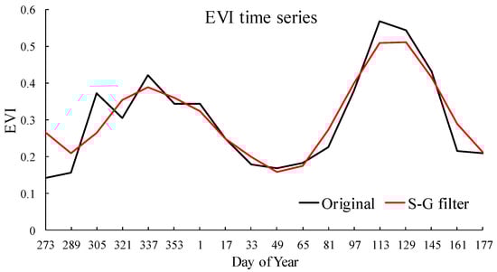 Enhanced vegetation index (EVI) time series before and after S–G filter smoothing.