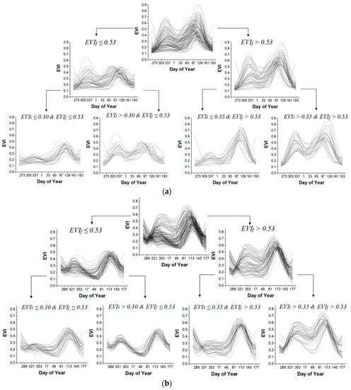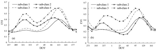 In this study, the intraclass variability of winter wheat was fully considered in the process of building the subclass sets of training samples. The over-wintering period is an obvious physical feature of winter wheat fields, which divides the entire winter wheat growth period into two phases and results in double peaks in the EVI curve. In Figure 4, the EVI peak values before the wintering phase change from 0.1 to nearly 0.65 and the second peak values vary from about 0.35 to around 0.85. The wide differences at each EVI peak exhibit obvious winter wheat intraclass variability, which was adopted as the unique features to extract subclass training samples. Selecting these two EVI peaks as the segmentation points to divide subclasses is more appropriate than other points.