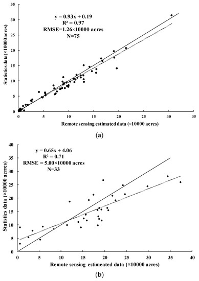 Root mean square error (RMSE) and coefficient of determination (R2) were used to compare the statistical data and estimated winter wheat areas at the county level for the two study areas as:
