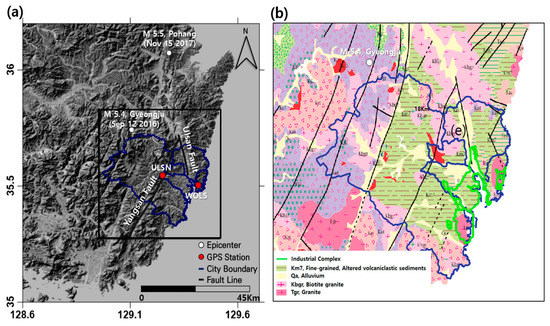 Korea, where the target area of this study is located, has previously been considered relatively safe from seismic hazards owing to an absence of major active tectonics. However, two recent earthquakes, the 2016 Gyeongju (magnitude 5.8, depth of epicenter 15.2 km) event [5,6,7] and the 2017 Pohang (magnitude 5.4, depth of epicenter 6.9 km) earthquake event [8,9], have aroused national concern about the safety of residential, industrial, and social infrastructure. Before the 1990s, Korea did not have any regulations on earthquake resistant construction design; given the growing population and development of industry and infrastructure, this could trigger socio-economically disastrous events, the so-called domino effect [10]. The south-eastern part of the Korean Peninsula is the densest industrial hub equipped with chemical, heavy machinery, and atomic power planets; incidentally, in close proximity with the epicenters of the two recent earthquakes. Although the magnitude of two earthquakes were below generally accepted critical values (magnitude 6.5 to 7.0) for significant structural damage, the city of Ulsan fell under public scrutiny because of its high concentration of transportation networks for chemical agents, heavy production facilities, and high population density. There is concern for the safety of the city from coseismic, postseismic, and even preseismic surface motion, based on historical cases [11,12,13,14]. A major concern is the vulnerability of industrial pipelines filled with toxic and combustible liquid materials [15,16]; note that earthquakes are responsible for 5% of all incidents of poisonous chemical material exposure [17,18]. In addition, direct damage from earthquakes include the impacts of liquefaction, which could result in serious damage to sensitive industrial facilities. Hence, a series of studies are being conducted to assist with the preemptive design of facilities and postinvestigation methods [19,20,21].