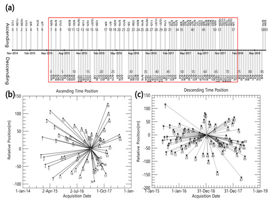 Acquisition time (a) and connection graphs of employed Sentinel-1 InSAR pairs (b,c). In total, 60 ascending and 86 descending images were employed for time series analysis. Note: the red box in (a) represents the target period of decomposition.