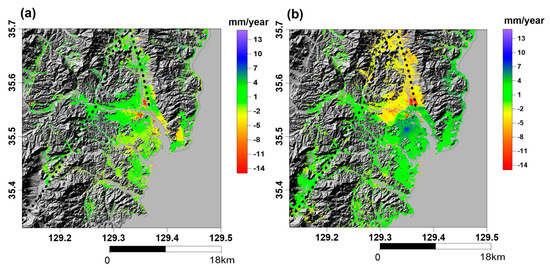 (a) Line of sight (LOS) displacements by ascending mode InSAR time series analysis during November 2014 to July 2018 and (b) descending mode InSAR time series analysis during May 2015 to June 2018. Note the locations of the Yangsan and Ulsan fault lines, represented as dotted lines.