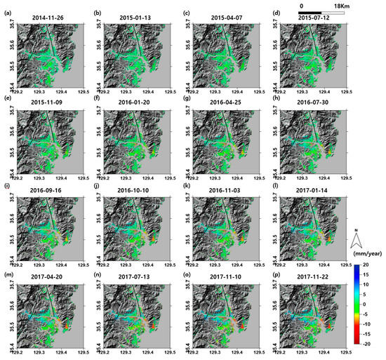 Temporal migration of LOS deformation in descending mode during the 2015–2018 period. The referencing time of deformation is 25 May 2015. Deformation along the Ulsan fault was apparent first.