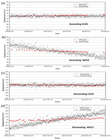 Ascending mode LOS deformations compared to ULSN (a) and WOLS GPS data (b) and descending mode LOS deformations compared to ULSN (c) and WOLS GPS data (d) are presented. Total cumulative values during January 2016 to July 2018 were analyzed. All GPS and InSAR observations are referenced to 01 March 2017 for seasonal variation processing. Note the seasonal correction in WOLS is only applied to Up-Down GPS observation as seasonal correction on the E–W GPS component produced a highly scattered pattern. The systematic migration speed differences in (b) and (d) were explained by the referencing issue and peculiar drift of southern Korean peninsula.