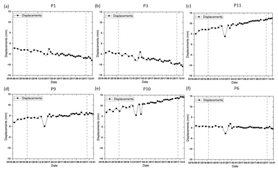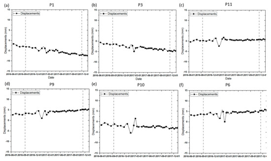 Time series observations of vertical displacements in unit (a) P1, (b) P3, (c) P11, (d) P9, (e) P10, and (f) P6. Two vertical dotted lines represent the 2016 Gyeounju (12 September) and 2017 Pohang (15 November) earthquakes.