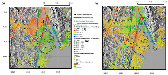 At first, to quantitatively evaluate the future fault failure risk in the target zones, we modelled the coulomb stress on the lineament for the Ulsan central city area and for the industrial parks (Figure 10). Since the stress during earthquake is transferred by propagation along surrounding faults and segments [70,71] as well as regional dispatch, CFF estimation on the lineament close to the target area implies the risks of the time of future potential earthquakes. From our observations, we now know there is a discontinuity between the Ulsan fault units and the deformation units of the central city area, which may represent the boundary of sedimentary plains. However, we also propose the existences of a second boundary between sedimentary plains and reclaimed grounds where the industrial parks are mostly located. We defined two lineaments (L1 and L2, represented as boundaries 1 and 2 in Figure 10) along with those boundaries between Unit 2 and 4 and calculated the CFF employing the modelled Ulsan fault line parameters. As demonstrated in Figure 10, it was found that many of the heavy industrial parks, and especially UPC, are in highly stressed areas. It should be noted the locations of chemical agent leakages for 2017–2018 are along with the western discontinuity, L1. Although this observation cannot be taken as direct evidence of the leakages being induced by surface deformation, we can infer that the eastern side of UPC most likely belongs to a unit that is susceptible to tectonic deformation and consequent industrial disaster at the time of earthquakes.