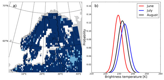(a) Shapiro-Wilk test for normality of the distribution shown for July. Dark blue regions null-hypothesis is not rejected, i.e., the data appears to be normally distributed. Light blue regions null-hypothesis is rejected, and white regions (over land) had too few years of data for testing. (b) Example PDFs of the fitted brightness temperature for boreal summmer months, June (red), July (blue) and August (black) for the grid-cell covering N and E.