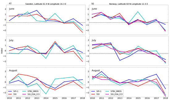 Figure 2 shows time-series of the SPI-1 (blue), STBI_SMOS (cyan), SSI_LDAS (red) and SSI_ESA_CCI (mangenta) over a grid-cell in Sweden ( N and E) (a) and Norway ( N and E) (b) from 2010 until 2018 for the boreal summer months, June, July and August. The two regions were selected to represent a region with and without the SSI_ESA_CCI data, and therefore show how the STBI_SMOS can represent regions where SM retrievals are masked. Furthermore, these two regions were affected by the 2018 summer drought, as seen from the negative anomalies in the indices for 2018.