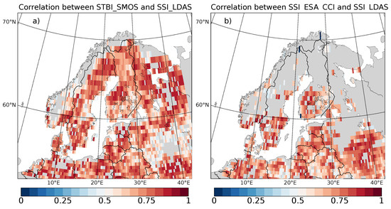 (a) Pearson correlation coefficient between the STBI_SMOS and SSI_LDAS, red regions indicate a high positive correlation, masked (grey) regions have a correlation not significantly different from zero. (b) Same as a) but for the Pearson correlation between the SSI_ESA_CCI and SSI_LDAS.